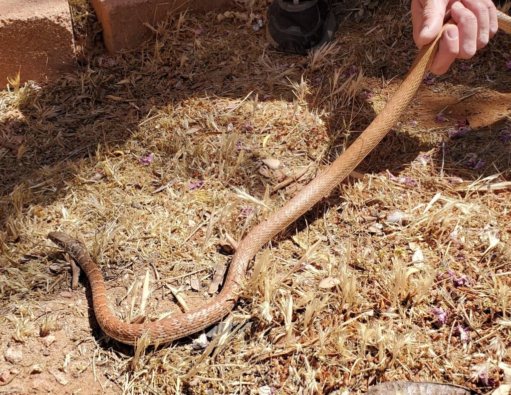 Of course, I had to catch him for a minute–to get a better look. He was a coachwhip snake, and he didn’t really fuss about it. I held him gently but firmly by his whip-like tail. We got some pictures and admired him for a few minutes. His visit constituted a rare show of desert hospitality. When we were satisfied, we let him go, and off he slithered into a pile of warm rocks near the fence, presumably to catch some breakfast. My boy’s eyes were left wide open, and my eyebrows lifted. We’d seen many wild snakes before. But this time, a snake had come to see us.